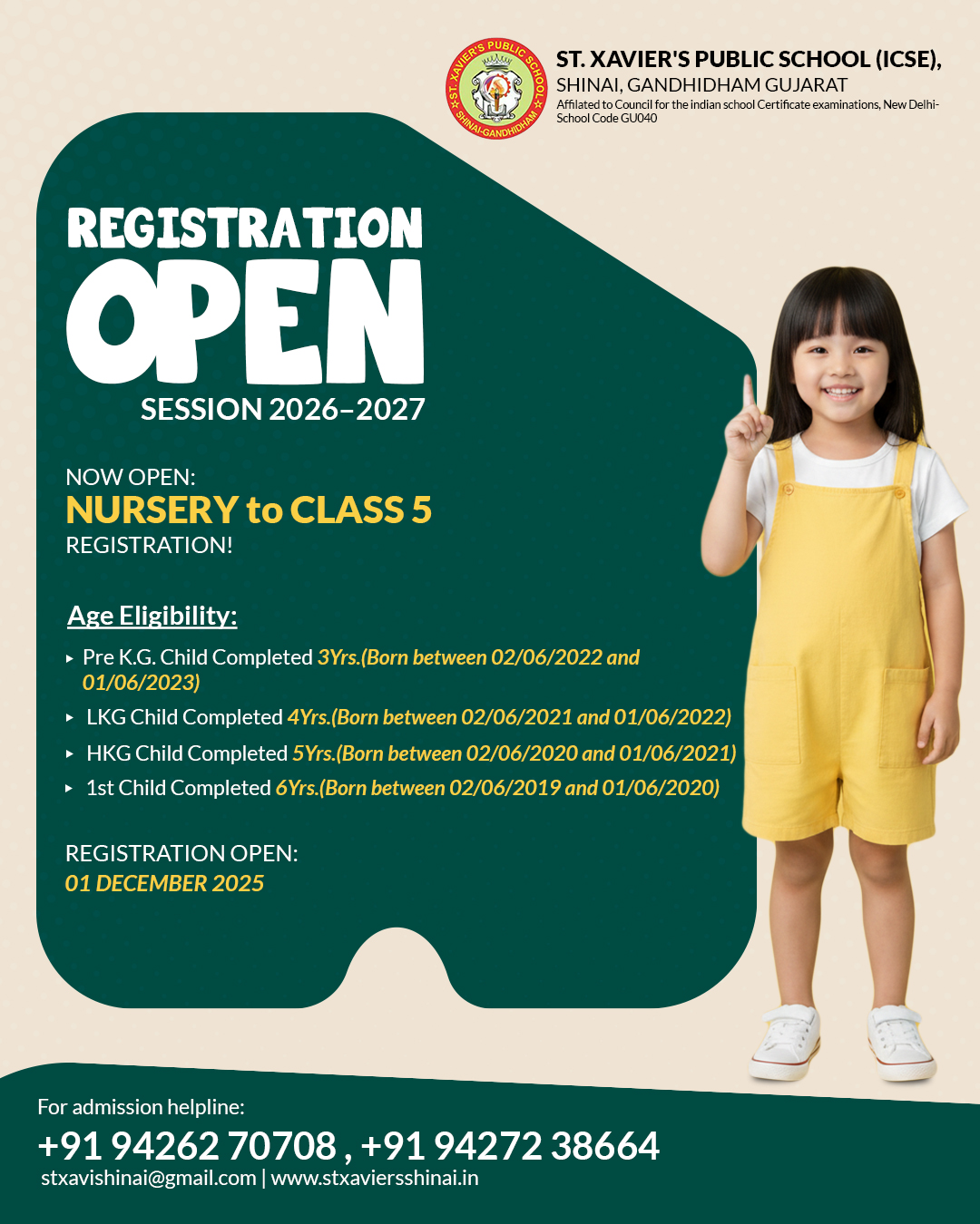 ST. XAVIER'S PUBLIC SCHOOL (ICSE), SHINAI - GANDHIDHAM, started in 2013, by 'Kutch Seva Trust' is a registered body,